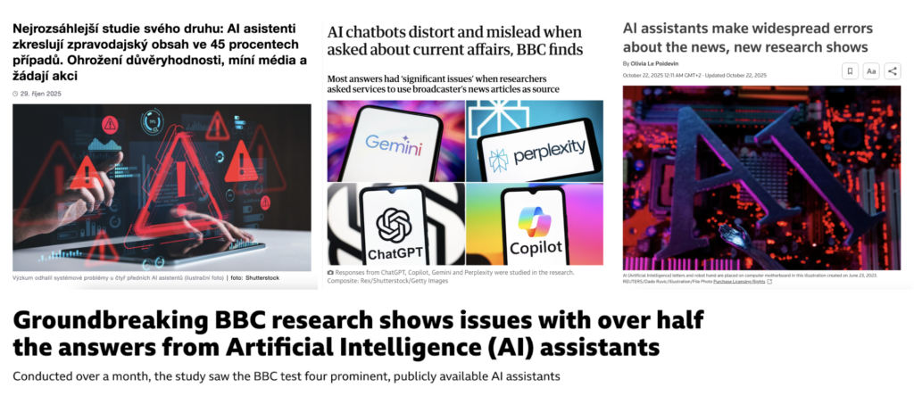 Příklady mediálních výstupů ke studii EBU/BBC ilustrují, jak je veřejná debata o AI často rámována především skrze selhání, bez zohlednění kontextu nerovnoměrných a rychle se vyvíjejících schopností modelů. Zdroj: rozhlas.cz, The Guardian, Reuters, BBC.
